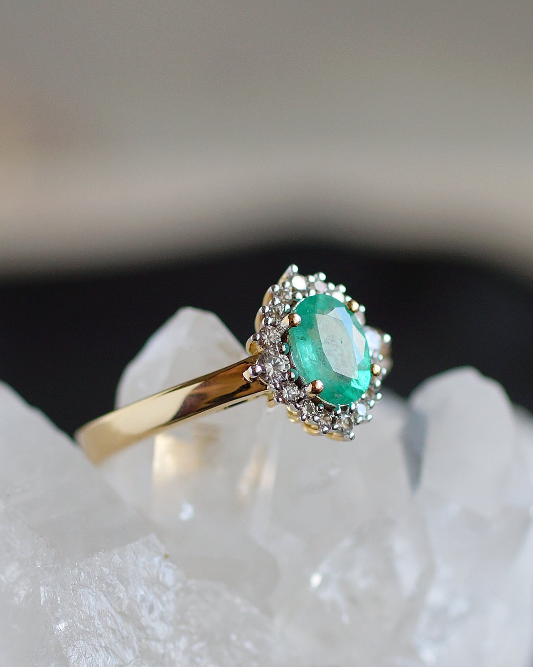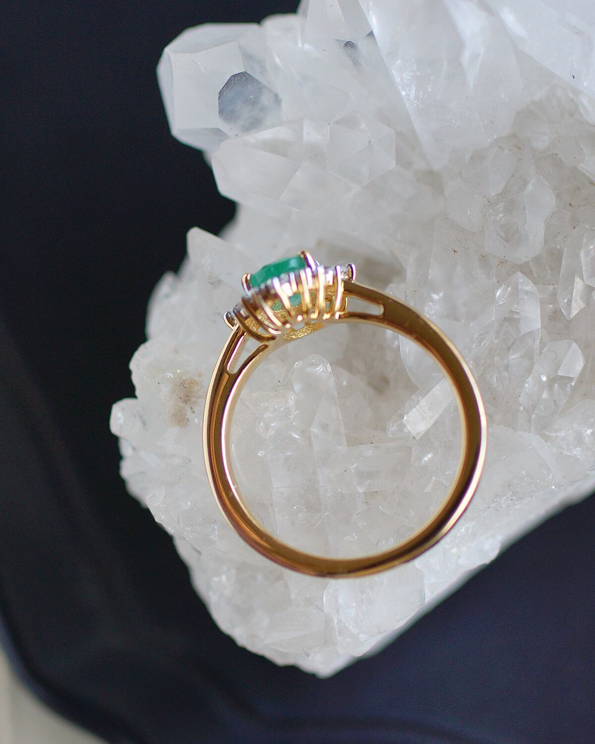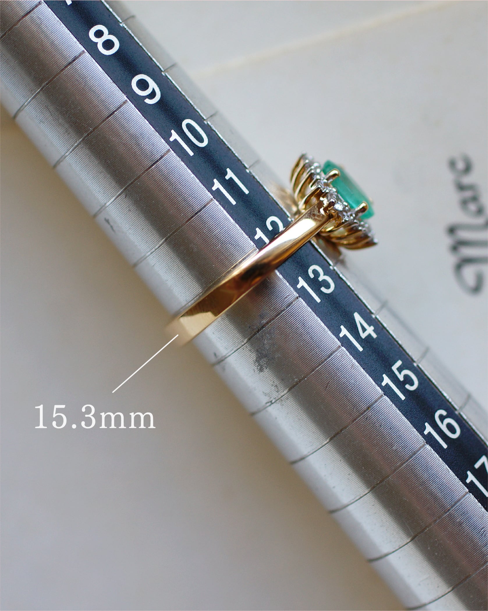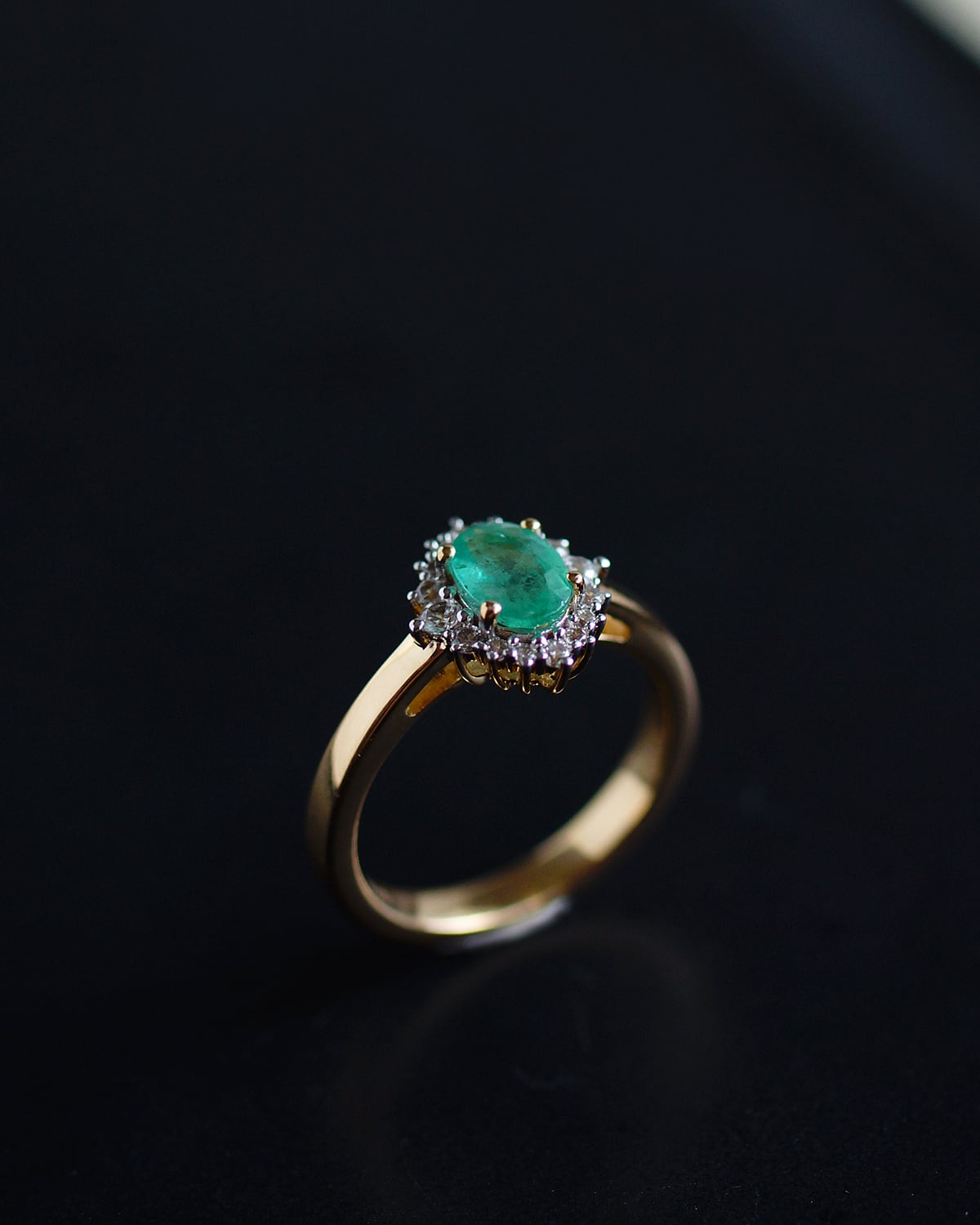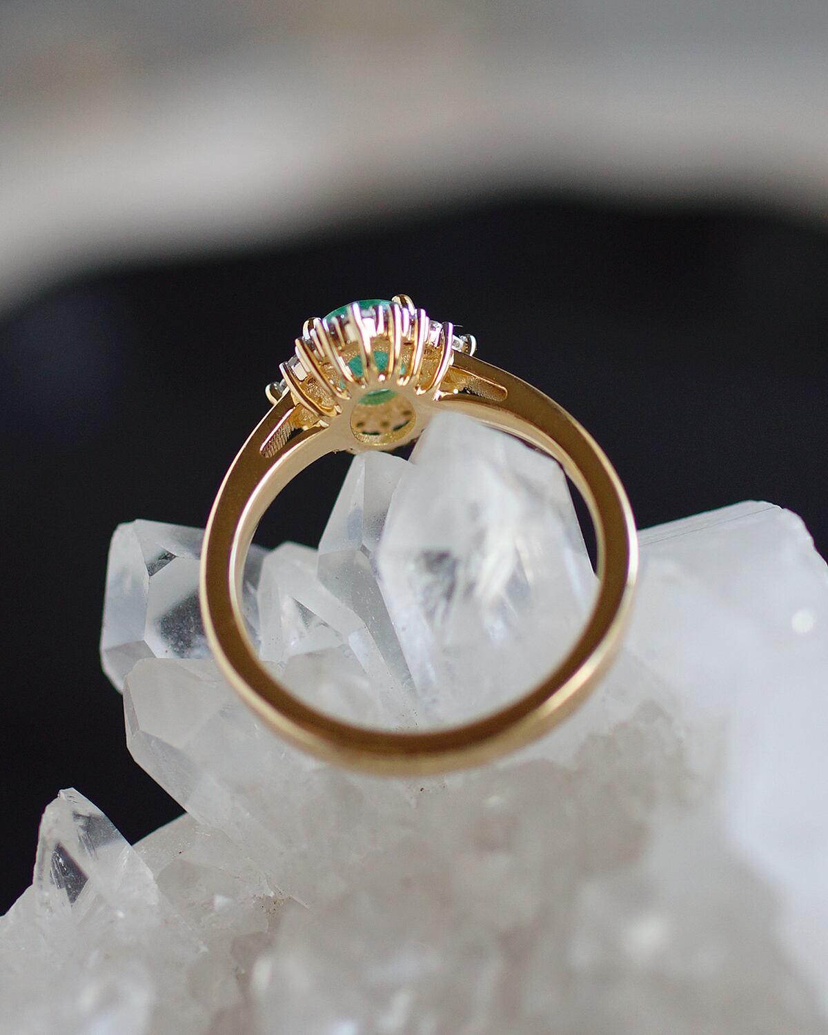 エメラルドの周りを大小のホワイトジルコンで囲い、