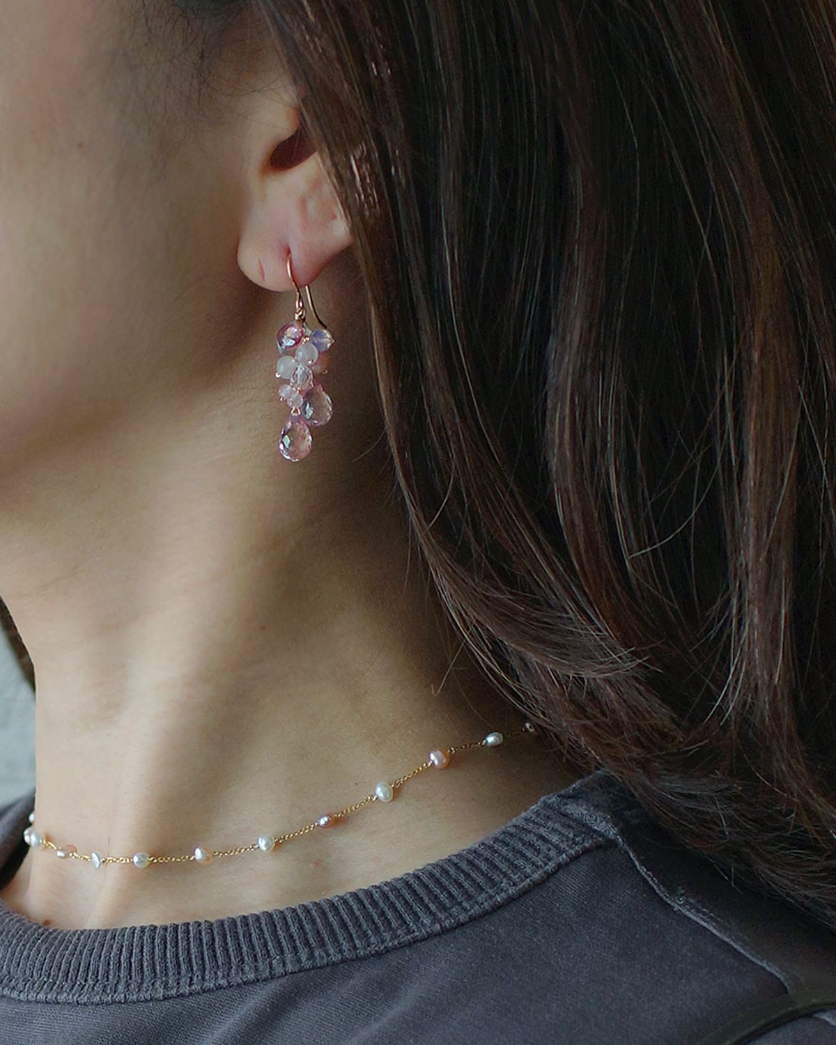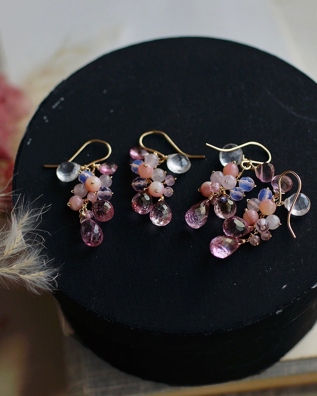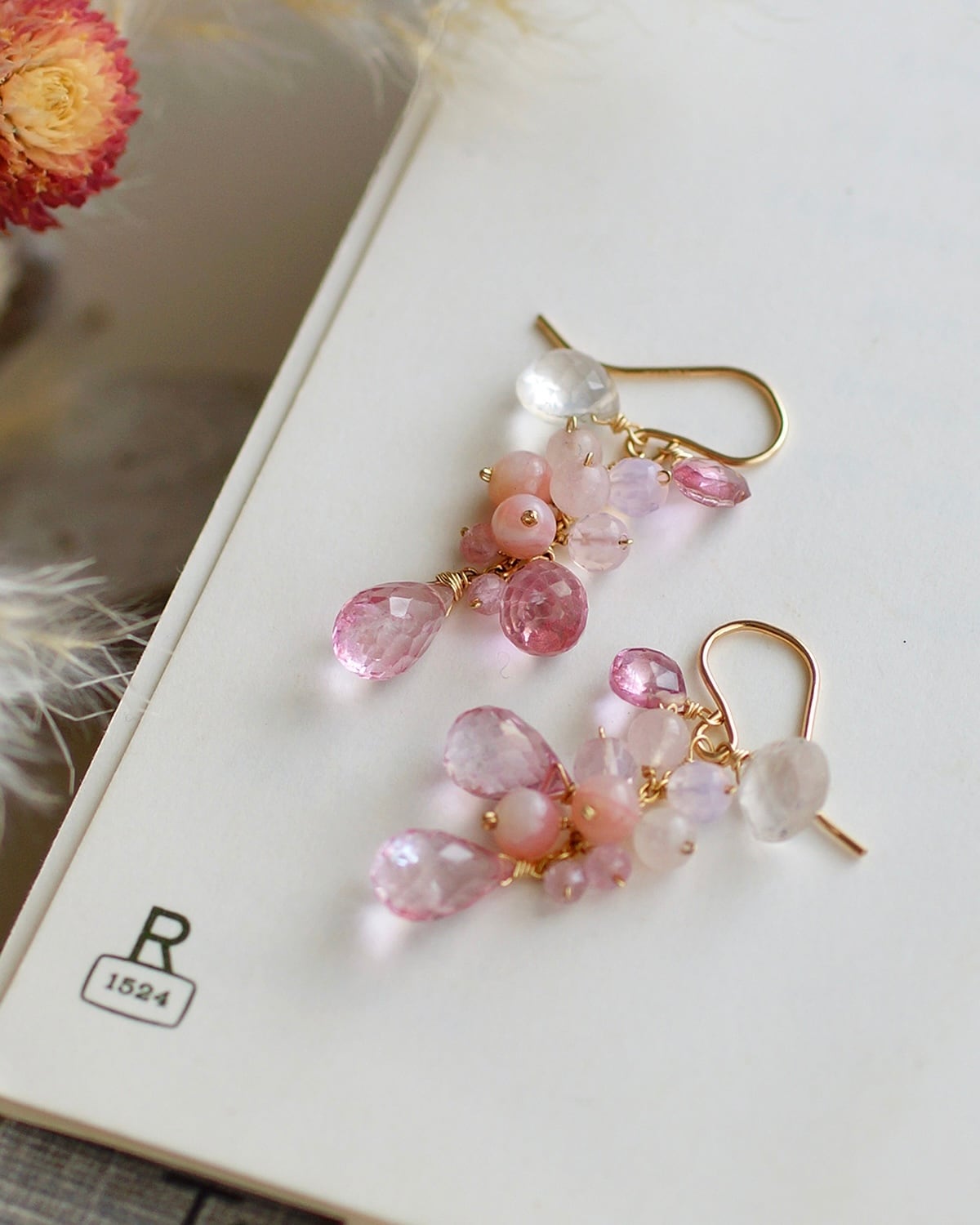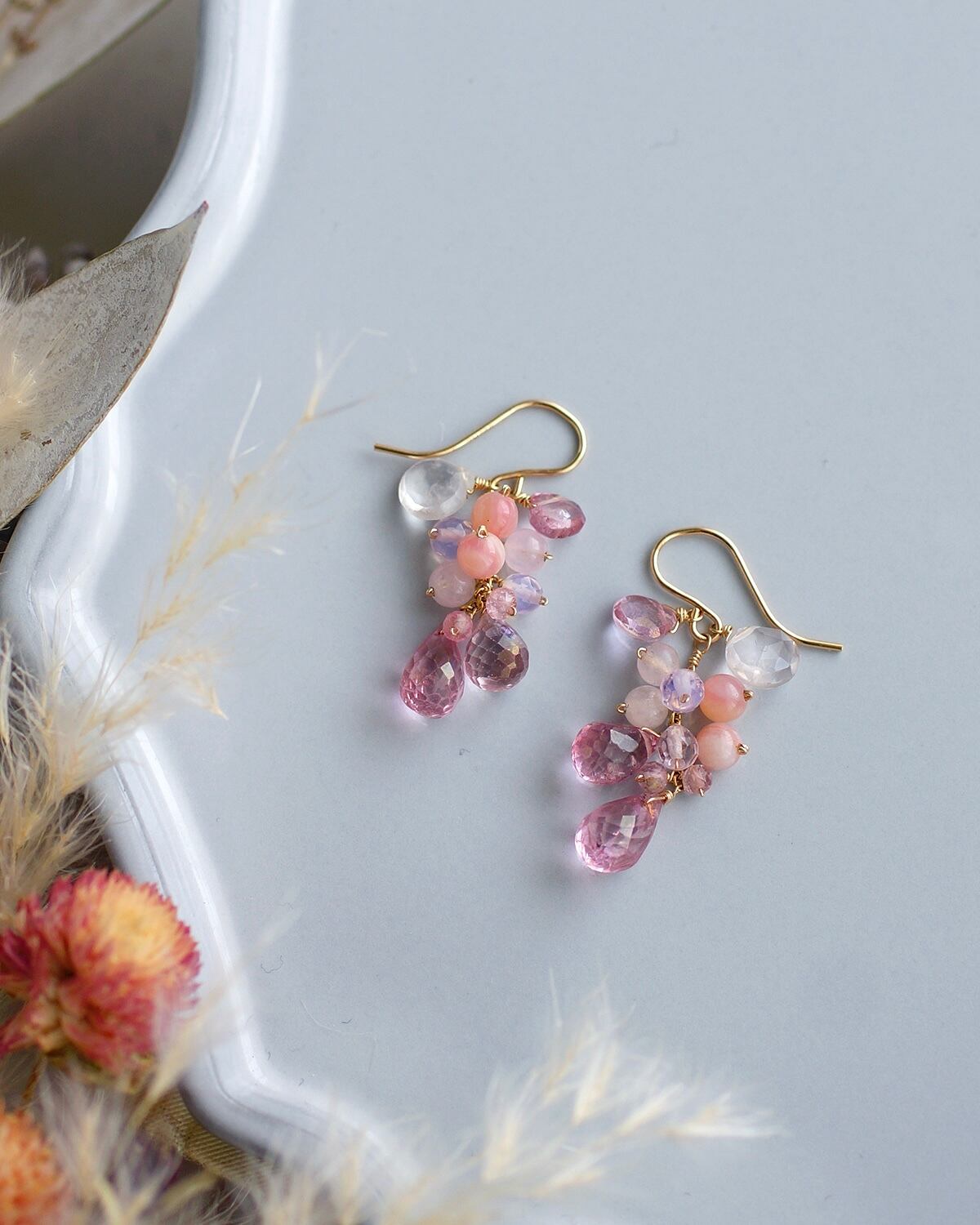 ピンクトパーズと天然石のピアス